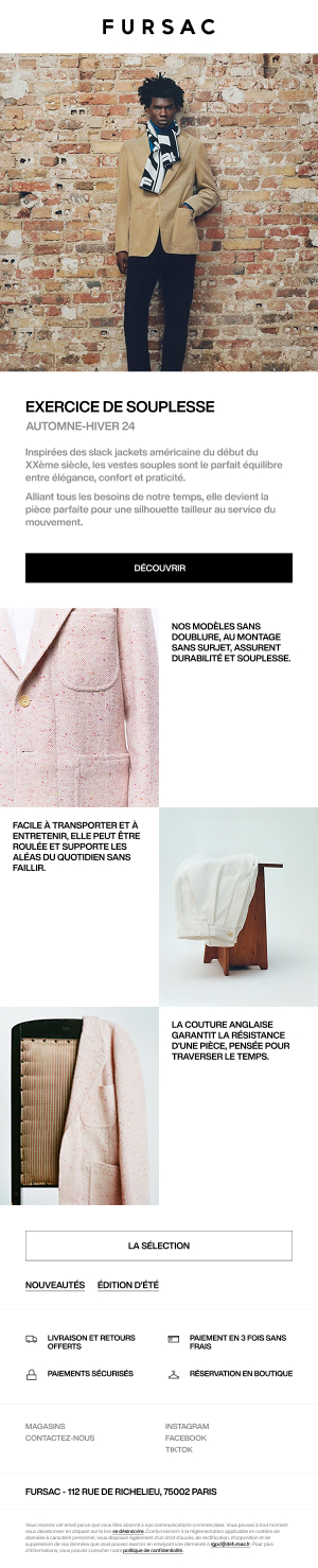 Fursac, a French menswear house renowned for its modern tailoring and iconic suits, partnered with Period•Paris to redesign its e-commerce platform. The new website was conceived to reflect and amplify the brand’s refreshed visual identity—bold, refined, and contemporary—while delivering a smoother, more elevated shopping experience.In addition to the redesign, dedicated newsletter templates were developed to support the brand’s ongoing communication.